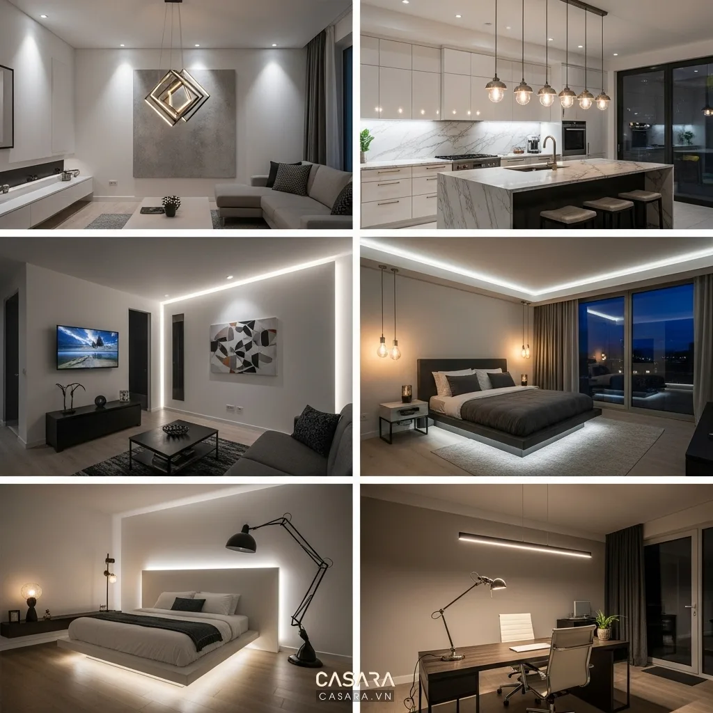 Trong thiết kế nội thất hiện đại, ánh sáng tự nhiên cần được tận dụng tối đa thông qua cửa kính lớn, rèm mỏng và bố trí nội thất cách xa nguồn sáng. Trong khi đó, ánh sáng nhân tạo cần phân lớp gồm: