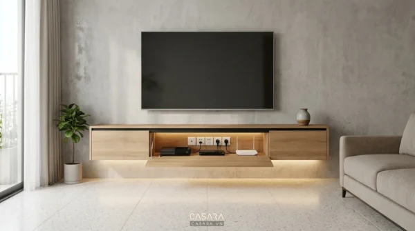 Kệ tivi không chỉ là nơi đặt các thiết bị giải trí mà còn giúp lưu trữ và trang trí phòng khách. Nên chọn các loại kệ tivi tích hợp ngăn kéo, tủ treo tường hoặc tủ âm tường để tận dụng tối đa không gian. Các kệ trang trí có thể được bố trí trên tường hoặc góc phòng, giúp bạn trưng bày những món đồ yêu thích như sách, tượng trang trí, chậu cây mini hoặc tranh ảnh gia đình.