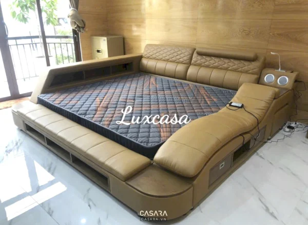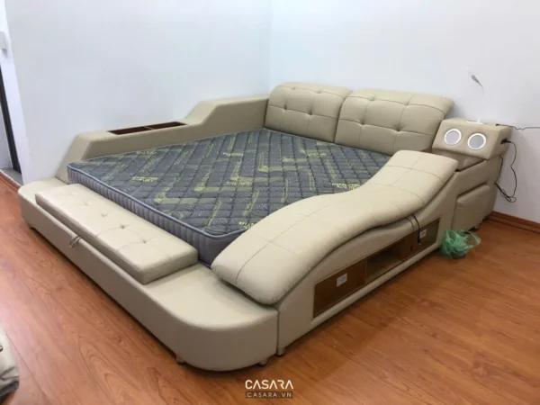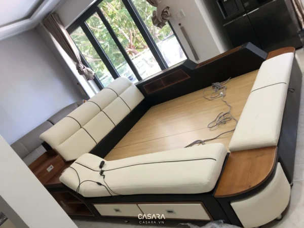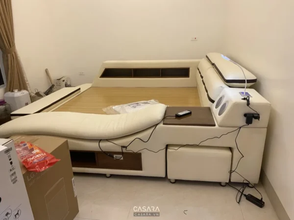 Điểm đặc biệt của giường thông minh là khả năng tích hợp nhiều tiện ích trong cùng một thiết kế. Hệ thống thư giãn với ghế massage, bàn làm việc gập gọn, kệ sách đầu giường,… được bố trí khoa học, giúp người dùng tận hưởng một không gian nghỉ ngơi hoàn chỉnh mà không cần rời khỏi giường. Đây là giải pháp lý tưởng cho cuộc sống bận rộn, năng động nhưng vẫn yêu cầu sự đẳng cấp và thư giãn tối đa.