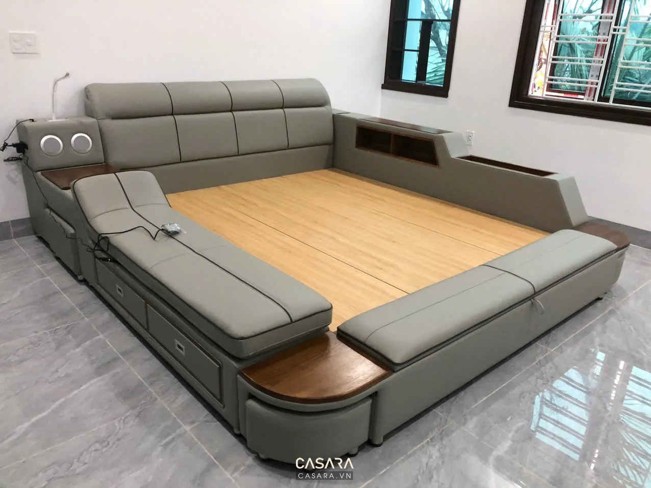 Khác biệt của giường thông minh tiện ích đến từ loạt tính năng tích hợp gọn gàng nhưng cực kỳ hữu ích: ghế massage điện ngay bên thành giường, hệ thống loa Bluetooth, cổng sạc USB, bàn để laptop tiện lợi cùng nhiều ngăn chứa sách và vật dụng cá nhân tinh tế. Tất cả đều được bố trí hợp lý để người dùng tận hưởng không gian sống gọn gàng, hiện đại mà không cần hy sinh diện tích. Chiếc giường không chỉ là nơi ngủ – mà còn là góc thư giãn, làm việc, giải trí lý tưởng trong chính căn phòng của bạn.