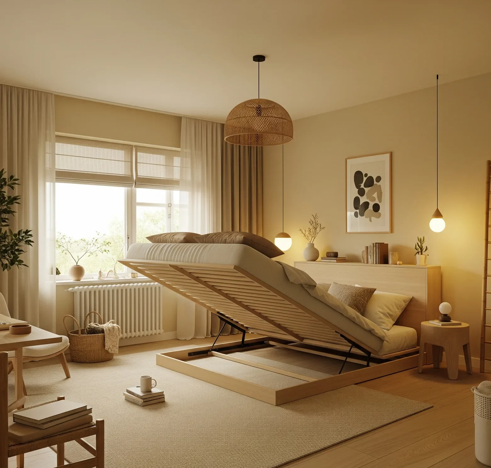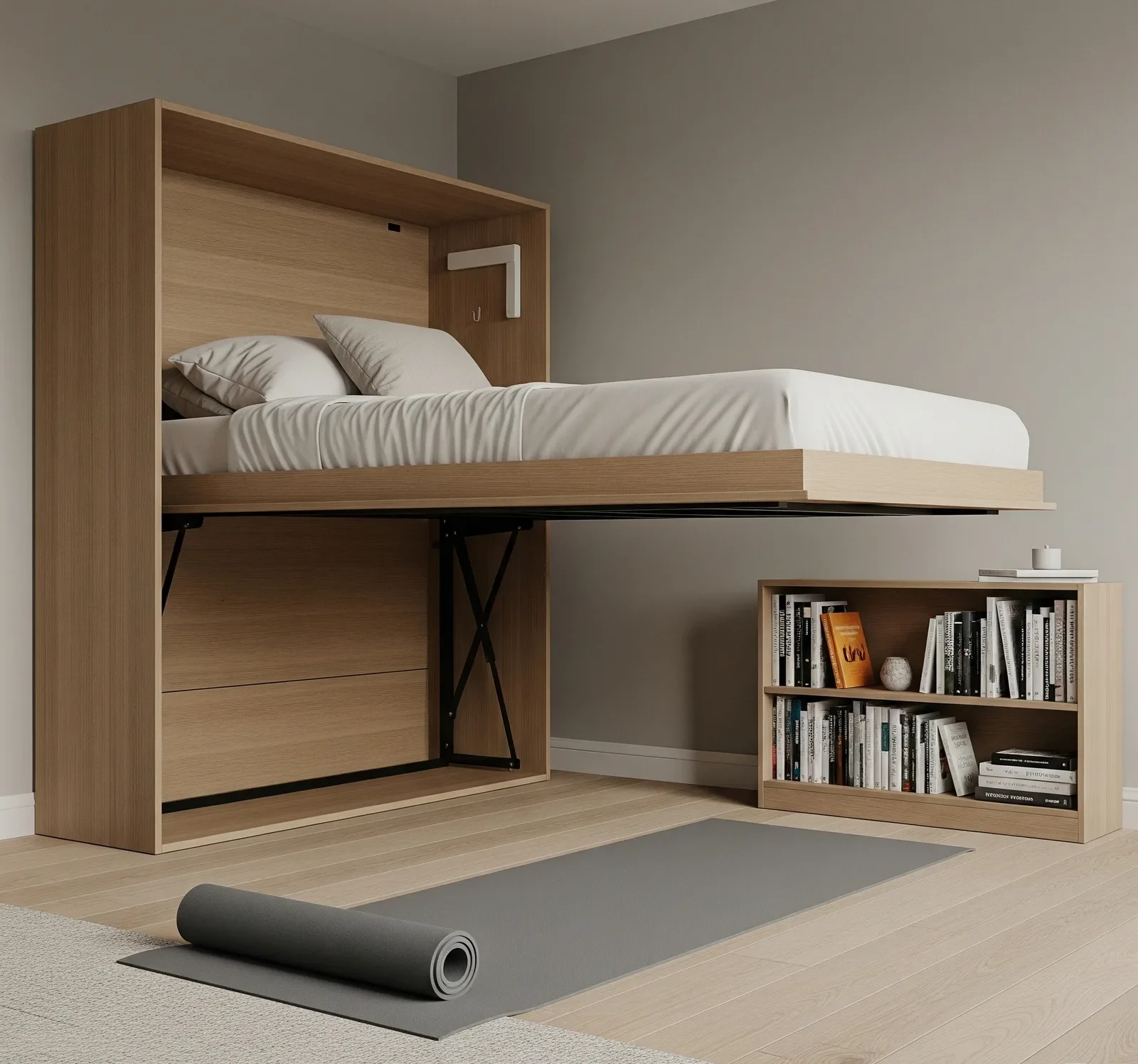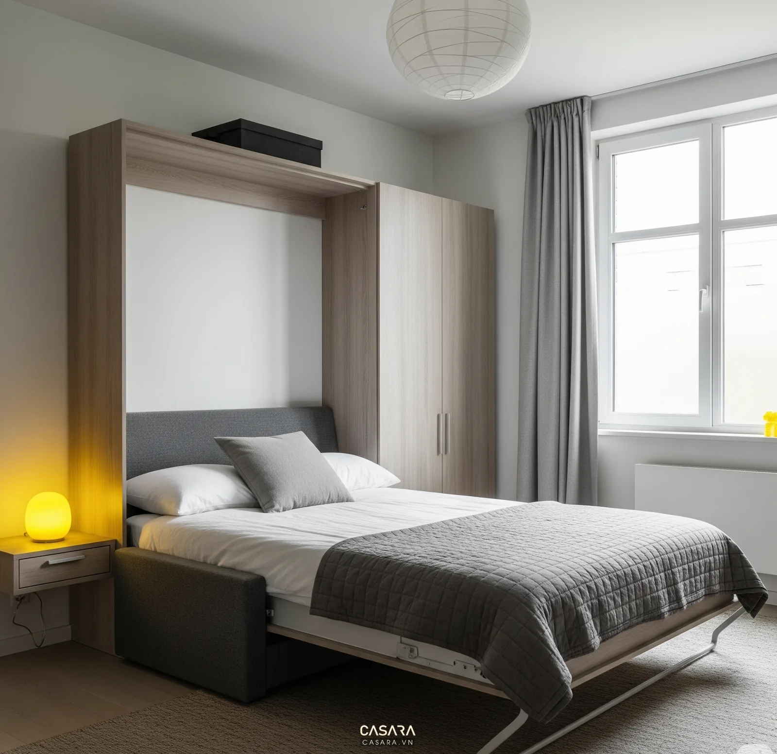 Buổi sáng, bạn nâng giường lên để có sàn trống cho vận động nhẹ. Buổi tối, bạn hạ giường xuống cho giấc ngủ sâu. Cuối tuần, bạn có thể gập giường lại để biến căn phòng thành phòng đọc hoặc góc thiền.